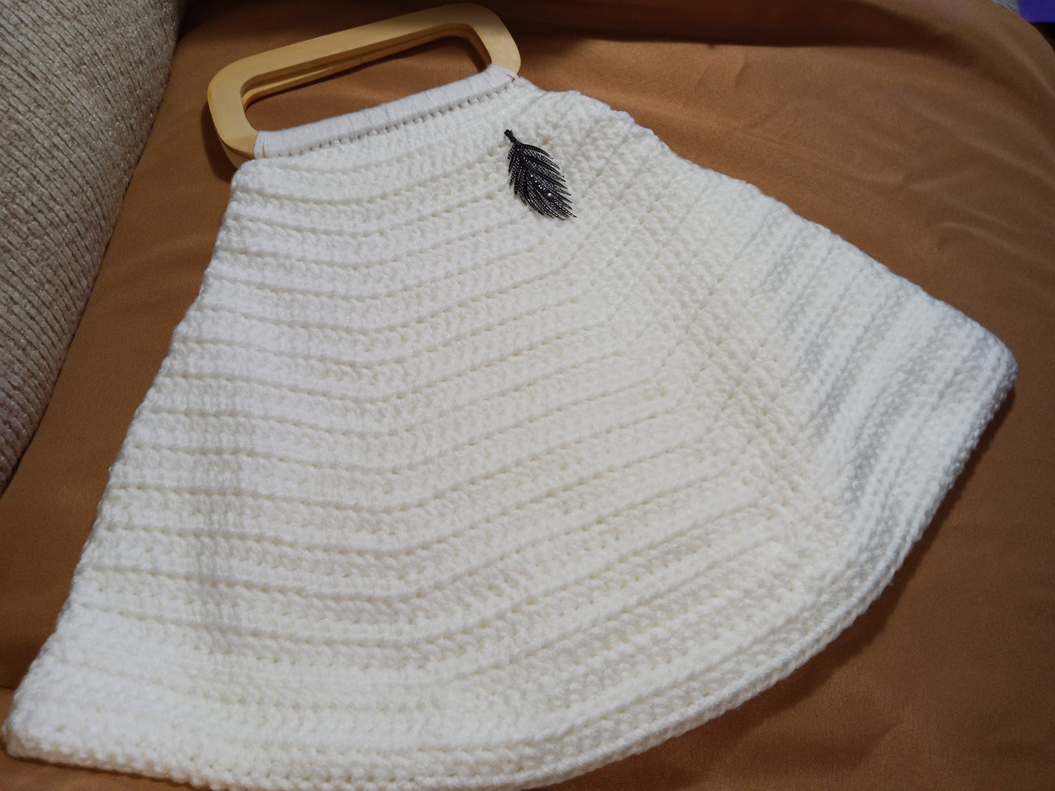 Introducing the Pyramid SC, a luxurious white handbag handcrafted from premium acrylic. Its intricate crochet design and wooden handles exude sophistication, while the elegant black feather embellishment adds a touch of glamour. Elevate your style with this exclusive piece that combines art and fashion.